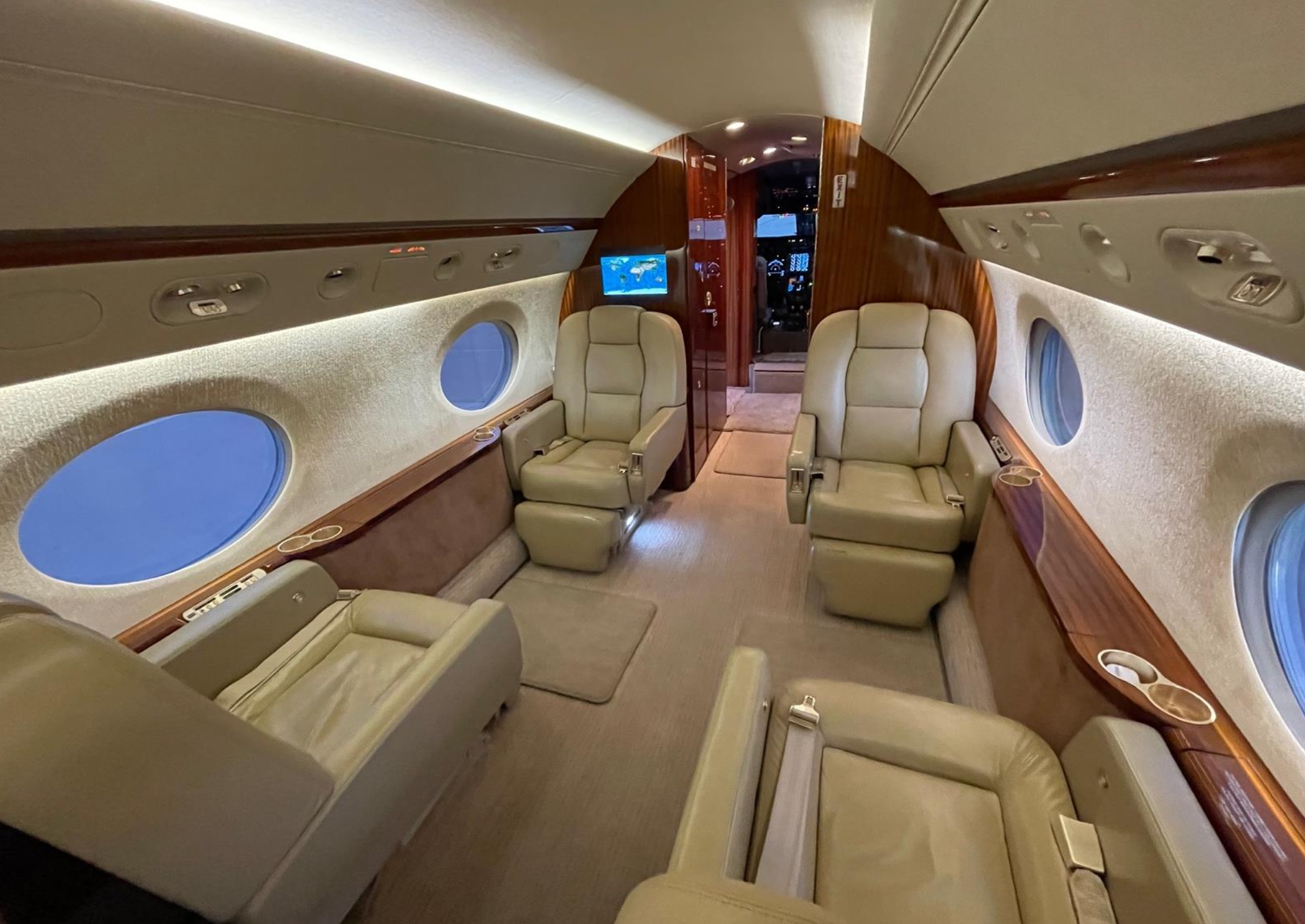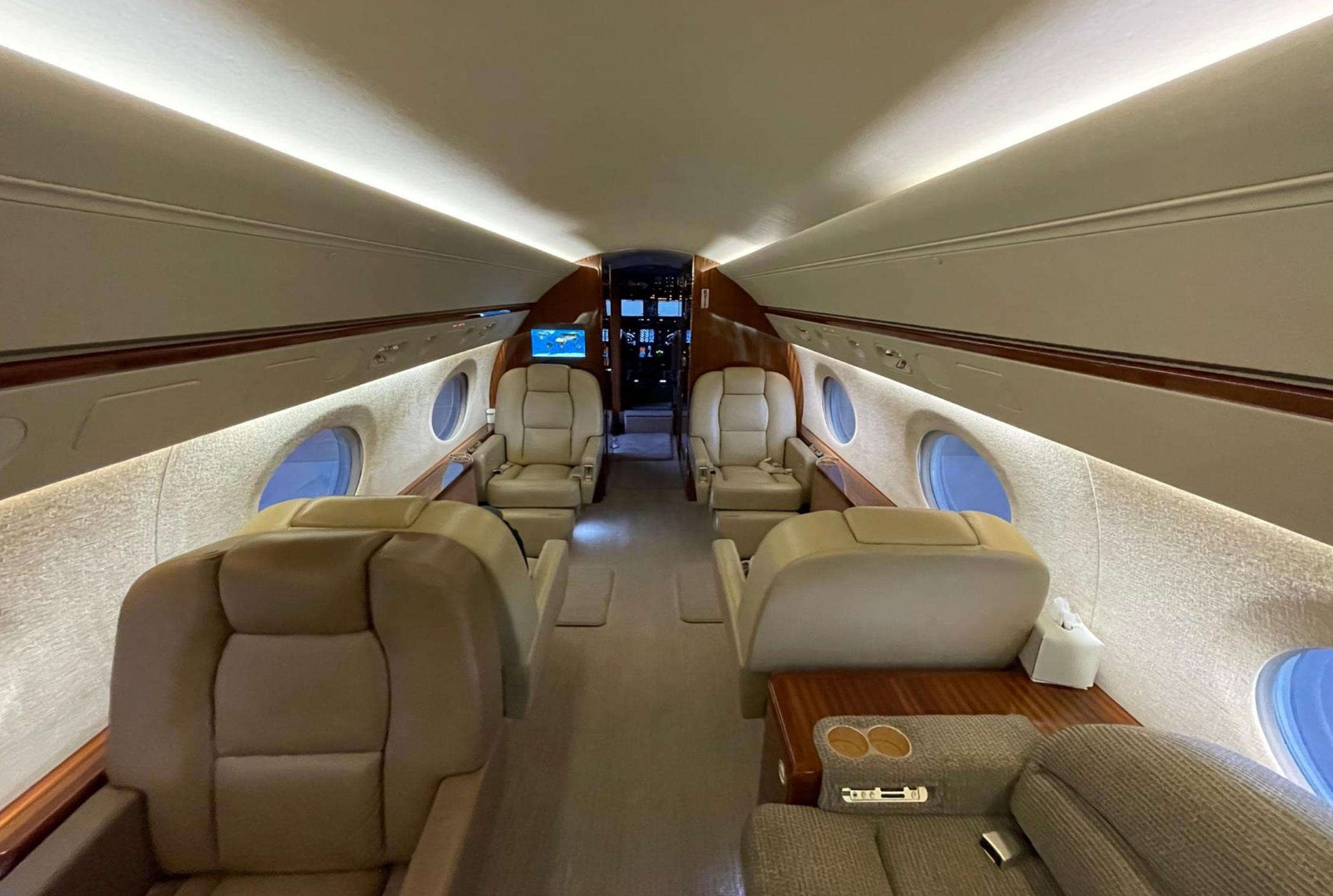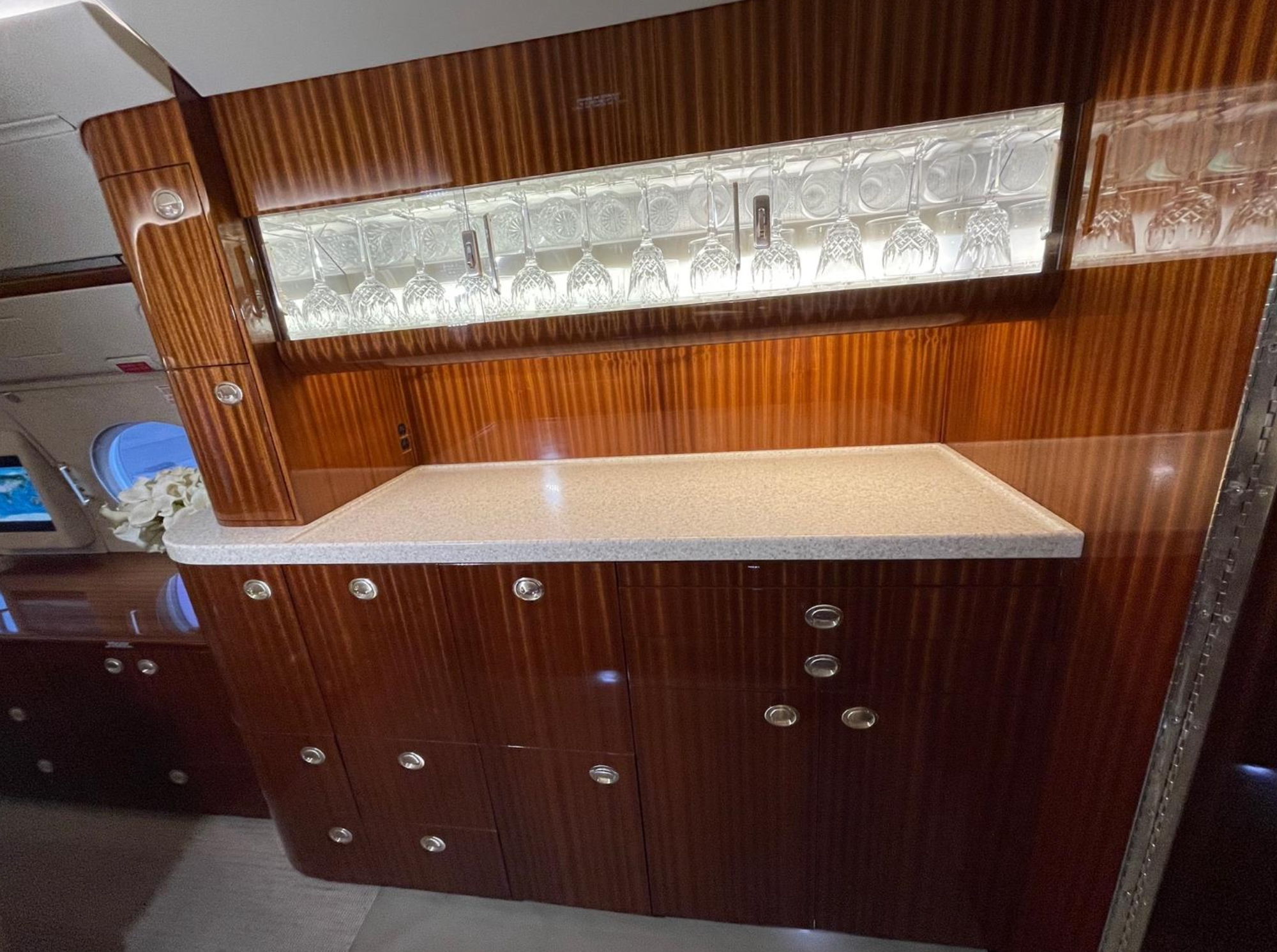 REFURBED 2019 – THE CABIN IS CONFIGURED FOR 14 PASSENGERS. ENTERING THE AIRCRAFT IS THECREW REFRESHMENT CENTER ON THE RIGHT-HAND SIDE IMMEDIATELY ACROSS FROM THE MAIN ENTRANCE DOOR FOLLOWED BY A RIGHT-HAND FORWARD CREW LAVATORY WITH COAT CLOSET AND FOLD DOWN SINK. MOVING INTO THE MAIN CABIN IS A FOUR (4) PLACE CLUB FOLLOWED BYA LEFT HAND TWO (2) PLACE CLUB THAT OPPOSES A FOUR (4) PLACE MECHANICALLY BERTHABLE DIVAN ON THE RIGHT-HAND SIDE. MOVING AFT IS A LEFT HAND FOUR (4) PLACE CONFERENCE/DINING GROUP WITH MECHANICAL TABLE THAT OPPOSES A RIGHT-HAND CREDENZA THAT FEATURES A DVD PLAYER, CD CHANGER AND FULL CABIN ENTERTAINMENT CONTROLS WITH A 17” LCD MONITOR DIRECTLY OVER THE CREDENZA. CONTINUING AFT IS THE MAIN GALLEY ON THE LEFT-HAND SIDE THAT FEATURES DUAL TIA COFFEE MACHINES, SHARP 1000W/R 21HT MICROWAVE OVEN, DUAL ZONE CONVECTION OVEN, COLD AIR CHILLER, SINK, AND ROCKWELL COLLINS GALLEY/CABIN CONTROL PANELS. ON THE RIGHT-HAND SIDE IS THE GALLEY ANNEX FOLLOWED BY THE AFT LAVATORY WITH CHEMICAL TOILET ON THE RIGHT-HAND SIDE FOLLOWED BY THE BAGGAGE COMPARTMENT.