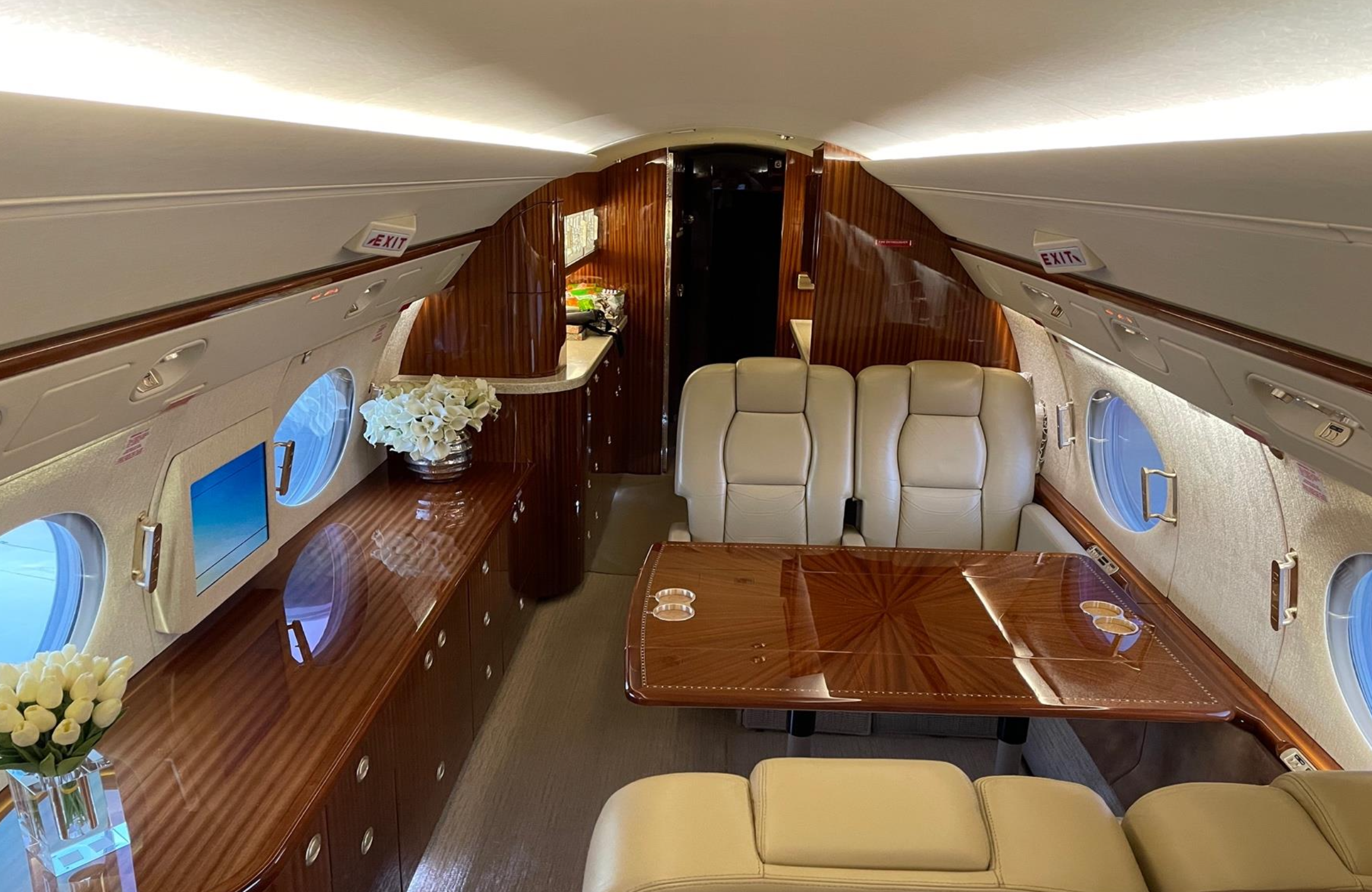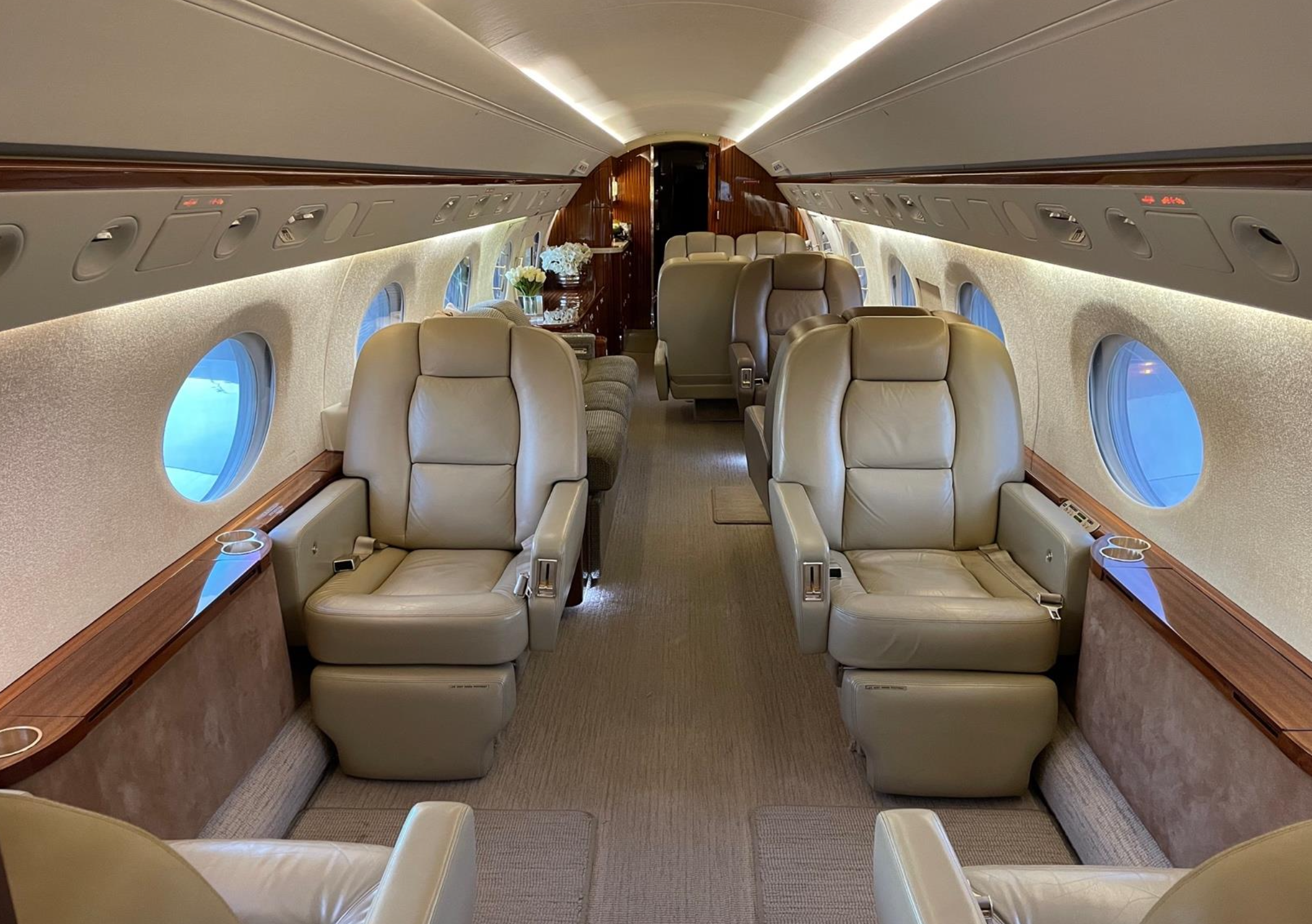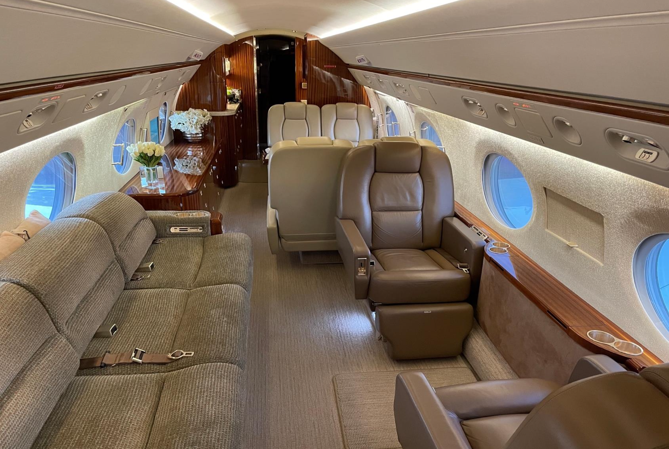 REFURBED 2019 – THE CABIN IS CONFIGURED FOR 14 PASSENGERS. ENTERING THE AIRCRAFT IS THECREW REFRESHMENT CENTER ON THE RIGHT-HAND SIDE IMMEDIATELY ACROSS FROM THE MAIN ENTRANCE DOOR FOLLOWED BY A RIGHT-HAND FORWARD CREW LAVATORY WITH COAT CLOSET AND FOLD DOWN SINK. MOVING INTO THE MAIN CABIN IS A FOUR (4) PLACE CLUB FOLLOWED BYA LEFT HAND TWO (2) PLACE CLUB THAT OPPOSES A FOUR (4) PLACE MECHANICALLY BERTHABLE DIVAN ON THE RIGHT-HAND SIDE. MOVING AFT IS A LEFT HAND FOUR (4) PLACE CONFERENCE/DINING GROUP WITH MECHANICAL TABLE THAT OPPOSES A RIGHT-HAND CREDENZA THAT FEATURES A DVD PLAYER, CD CHANGER AND FULL CABIN ENTERTAINMENT CONTROLS WITH A 17” LCD MONITOR DIRECTLY OVER THE CREDENZA. CONTINUING AFT IS THE MAIN GALLEY ON THE LEFT-HAND SIDE THAT FEATURES DUAL TIA COFFEE MACHINES, SHARP 1000W/R 21HT MICROWAVE OVEN, DUAL ZONE CONVECTION OVEN, COLD AIR CHILLER, SINK, AND ROCKWELL COLLINS GALLEY/CABIN CONTROL PANELS. ON THE RIGHT-HAND SIDE IS THE GALLEY ANNEX FOLLOWED BY THE AFT LAVATORY WITH CHEMICAL TOILET ON THE RIGHT-HAND SIDE FOLLOWED BY THE BAGGAGE COMPARTMENT.